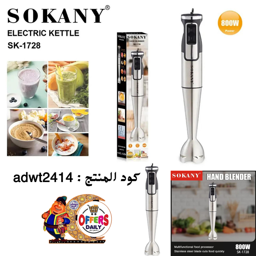 خلاط يدوي كهربائي 800 واط ماركة SOKANY – موديل SK.1728 قوة 800 واط. الجهد االكهربائي : 220 فولت. شفرات من الفولاذ المقاوم للصدأ. عدد السرعات : 2 . يمكن استخدامه لصنع الخلطات والكريمات والعصائر وحتى للهرس.